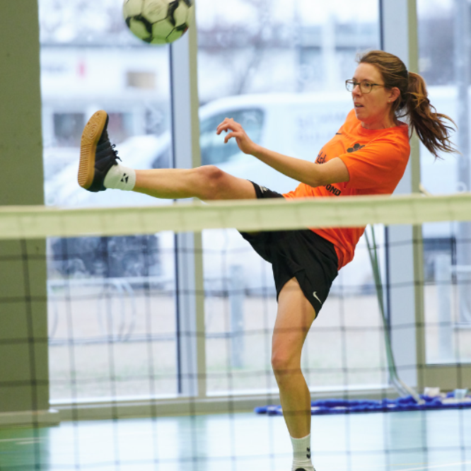 Kom og spil fodtennis med os. Vi er en blandet gruppe af kvinder og mænd fra ca. 30-45 år, der elsker at spille fodtennis. Der er plads i hallen til legende børn. Du behøver ikke have prøvet sporten før. Medbring blot indendørs tøj og sko.