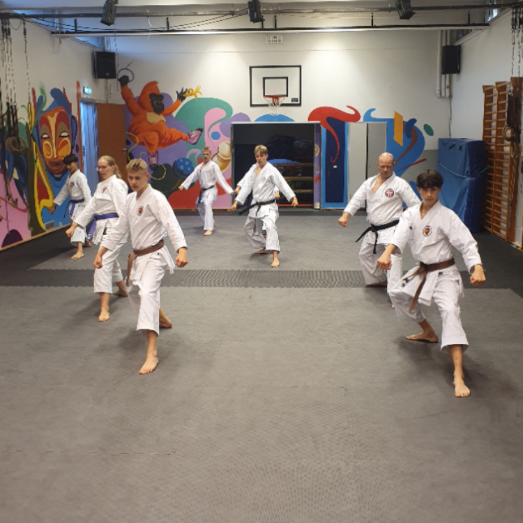 Træningen varetages af 2 sortbælter i tæt samarbejde med Sensei Jesper. Vi laver basis træning i karate teknikker som parader, slag og spark, derudover træner vi kata (sammensætning af teknikker i serier). Al træning bliver altid tilpasset den enkelte elev - her er plads til alle og vi har det sjovt. Medbring: Vandflaske, tøj du kan bevæge dig og godt humør! Vi træner på bare fødder. Nedenfor har Jakob fortalt om voksenholdet hos TKK: Ønsker du at prøve karate, men synes du, at du er blevet lidt for gammel til at begynde?! Frygt ej og pjat med dig... Vi er et voksenhold med folk mellem 18 og 65 år med vidt forskellig baggrund, form og kondition, og her er der plads til ALLE! Nogle har trænet karate "dengang" de var unge, har så holdt pause og ønsker nu at vende tilbage, nogle er blevet nysgerrige efter at have haft børn i klubben, og så er der dem, der bare ønsker at få bedre kondition og smidighed, men ikke gider det klassiske "fitnesskort". Personligt havde jeg aldrig forestillet mig at skulle begynde til karate, før min søn startede, og efter nogle måneder blev jeg spurgt, om jeg ikke havde lyst til at begynde på "voksenholdet". Dengang var jeg 39 år, i dag er jeg 47, og jeg er blevet mere og mere "hooked". I sommeren 2024 blev gradueret til sort bælte. Så hvad kan karate? Ud over fabelagtig god motion, core-træning og smidighedstræning, er jeg vild med måden, hvorpå man, selv i en "voksen" alder, kan blive (kraftigt) udfordret af hjernetræningen, når arme og ben skal "forsøge" (!) at bevæge sig på samme tid! 🙂 Jeg døjer med rygproblemer og en skulderskade - og jeg er ikke alene om at have lidt "slid" på kroppen. Der er meget få på holdet, der ikke døjer med et eller andet - om det så er nakkeproblemer, lidt ekstra kilo, en kunstig fod, osv... alle er ramt af "livet". MEN... Tro ikke, at det betyder, at der ikke bliver trænet igennem, snarere tværtimod! Vi accepterer, at vi hver især har begrænsninger, men giver den ellers alt hvad vi kan, og elsker både træningen og fællesskabet. Sååå... kom glad, få fingeren ud, og afsted til Dojo'en - vi glæder os til at møde dig 🙂 Karate-hilsner fra: Jakob - 1. dan